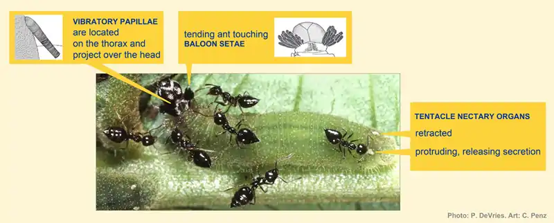 - ↑ DeVries, P. J. (1990) Enhancement of symbioses between butterfly caterpillars and ants by vibrational communication. Science 248: 1104–1106.