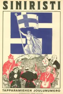 Siniristi was a deeply antisemitic magazine, and its antisemitism was mainly based on Christian antisemitism, which was the dominant current in Finnish society.[2] Tahvo Liljeblad published many articles on the relations of Christians and Jews: to him Jesus was the most powerful opponent of the Jews and was killed for challenging the teachings of the rabbis "which are fatal to humanity". As punishment the Jews were cursed and scattered by God.[3][4] In 1933 Siniristi published an exposé on the Talmud which supposedly contained attacks on Christianity, because the Jews understood Christianity stood against their world-conquest plans.[5]