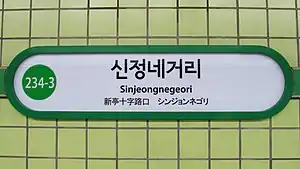 Sinjeongnegeori Station is a station on the Sinjeong Branch of Seoul Subway Line 2. In English, the name of the station is "four-way junction in Sinjeong-dong."[3]