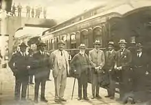 Sir Albert Bowen (in white suit) at the railway terminus in Lima, Peru, 1923