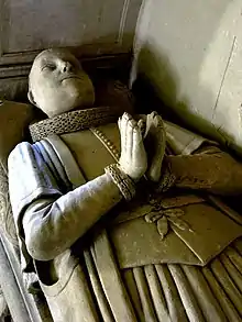 He was buried in St Michael's Church, Farway, where his monument showing under a recessed arch his recumbent effigy dressed in lawyer's robes, with hands together in prayer above his chest. A semi-recumbent effigy, possibly of his son, is below, shown fully dressed in armour with his bare head resting on a plumed helm.[13][14] Above Sir Edmund's effigy is a tablet inscribed: