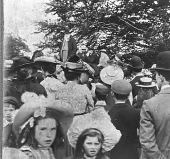 In those days, elections took place over several days. It was a time of open voting where 'tallies' or groups of ten likeminded freemen ascended a small scaffold erected adjacent to the Moot Hall, where the lord mayor publicly recorded each man's vote.[7] They were exciting times, a theatre crammed with noise and bustle: the playing of patriotic music by rival bands; the flaunting of flags and banners; the display of party favours and colours; the processions and counters processions; and the cheering and counter cheering.[8]