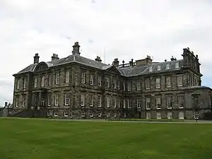 Moray later served on the Treasury Commission for Scotland, as did Alexander Bruce, now Earl of Kincardine. Bruce reported to this Commission as a revenue collector, and benefited from the patronage of its members.[5] The Commission had responsibility for the King's Works, and in 1667 Bruce was appointed Superintendent and Overseer of the Royal Palaces in Scotland. Four years later he was made Surveyor General of the King's Works in Scotland, with a salary of £3600 Scots (£300 Sterling, or £ 52,000 in 2024), for the purpose of rebuilding Holyroodhouse.[1] In March 1671, Bruce was part of a syndicate which bought the rights to collect taxes over a five-year period, paying £26,000 Sterling (£ 4.5 million in 2024) for the privilege. As such, it would appear that Bruce was not only the architect of Holyroodhouse, but one of the principal financiers of the £21,000 project.[5]