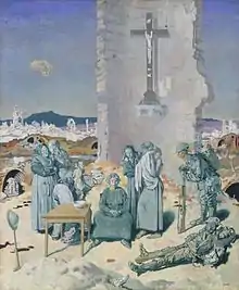 Orpen returned to France in July and spent a second summer painting on the old Somme battlefield and making frequent trips to Paris to complete a series of portraits of Canadian commanders. Later he painted the immediate aftermath of the fighting at Zonnebeke that had taken place during the Fifth Battle of Ypres.[34] Orpen made it clear he wished to remain in France and was keen to work in the newly liberated towns.[35] By the end of the summer of 1918, Orpen was mentally exhausted and his works became increasingly theatrical, less realistic and more allegorical. In Harvest (1918), which shows women tending a grave covered in barbed wire, he used a garish palette of colours to emphasize the unreal nature of the scene.[25] While Bombing: Night and Adam and Eve at Peronne seem somewhat flawed compositions, other paintings were far more successful. Most notably, The Mad Woman of Douai is a harrowing depiction of the aftermath of a rape. When Orpen met the woman some time afterwards she was 'silent and motionless, except for one thumb which constantly twitched'.[2] The two soldiers in the picture are both figures borrowed from other paintings of his, as is the grave in the foreground. Orpen had been shocked to see a number of such burial mounds with, as he wrote, "arms and feet showing in lots of cases".[36]