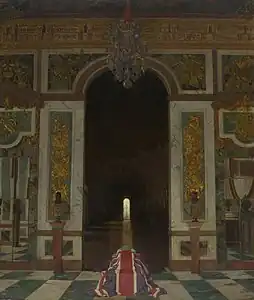 Orpen considered that the whole conference was being conducted with a lack of respect or regard to the suffering of the soldiers who fought in the war, and he attempted to address this in the third painting of the commission. This picture was to show the delegates and military leaders as they entered the Hall of Mirrors to sign the Treaty of Versailles. Orpen sent Evelyn Saint-George a letter detailing the original layout and composition of the work. Haig and Marshal Foch were at the centre with the other delegates on either side of them. Among the delegates, Orpen included two additional figures, a Grenadier Guards sergeant and Arthur Rhys-Davids, the young fighter pilot he had painted the week before he was killed in 1917.[6][39] After working on this composition for nine months, Orpen painted over all the figures and replaced them with a coffin covered by the Union Jack and flanked by a pair of ghostly and wretched soldiers clothed in rags, actually the figure from the painting Blown Up, Mad, with two cherubs above them supporting garlands of flowers. This painting, now known as To the Unknown British Soldier in France, was first exhibited in 1923 at the Royal Academy. The public voted it picture of the year, but almost all of the critics who reviewed the picture condemned it; and, from a handful of critics and newspapers, Orpen received sustained abuse and was accused of bad taste, technical ineptitude and, for the two figures either side of the coffin, sacrilege. Orpen did receive some letters of appreciation from ex-servicemen and from family members of soldiers who had died in the war, but he still felt the need to issue a statement explaining the picture and his intentions.[40] However, it was clearly not the group portrait the Imperial War Museum had commissioned, and the Museum refused to accept it. The picture remained in Orpen's studio until 1928 when, on his own initiative, he offered to paint out the cherubs and the soldiers if that would make it acceptable to the Museum. The then Director of the IWM replied that he would be happy to accept the picture as it was, or however Orpen wished to present it. Orpen painted out the soldiers and the painting was accepted by the Museum in 1928.[2][26][41]