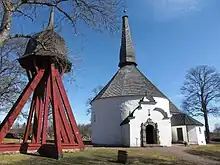 The church was built in the middle of the 12th century, and is the only remaining medieval round church in the Diocese of Skara. It derives its shape from originally being built to serve several different purposes; apart from a place of worship, it also served a defensive purpose, i.e. it was a fortified church. The church has been altered successively throughout the centuries. The church porch is not original though it may date from the Middle Ages. The large wooden spire was built in 1666, and a burial chapel for the Spens family was built in 1660. The burial chapel has served as the sacristy since 1810. Among the furnishings, the baptismal font is the oldest and dates from the 13th century. The altarpiece was donated to the church in 1748, while the pulpit was made in 1709. The church has two church bells, the larger of them was made in 1526. The vaults supporting the church ceiling were probably built at the end of the Middle Ages.[1][2]