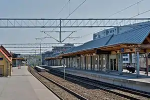 The Norwegian State Railways launched plans for Skøyen in 1992. The station would be expanded to four tracks and a new double track would be built to Asker Station—to allow both for higher speed and increased traffic.[11] Establishment of a new station at Skøyen was prioritized ahead of the opening of the Gardermoen Line, to allow for sufficient capacity to serve the Airport Express Train. However, there arose a dispute regarding zoning. Norges Varemesse wanted to build a new congress center at Skøyen, but the land for it came in conflict with the area needed for a new station. The land intended for the congress center was on land which had been bought from NSB 1990.[12] Construction commenced on 1 September 1996 based on designs by Arne Henriksen.[13] The upgraded station opened on 17 September 1998, having cost 295 million Norwegian kroner.[14] Skøyen remained a major site for turning of trains until 2015. With the opening of four platforms at Lysaker Station and new turning tracks at Høvik Station, most trains have since been extended to at least as far as Lysaker or Stabekk Station.[15]