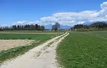 The Skaručna Basin has a characteristic mixed cultural landscape, with meadows, tilled fields, pastures, watercourses, vegetation corridors, hedgerows, isolated hills, and settlements on the edge of the floodplain.[2] Graben Creek starts at Loess Pond (Slovene: Phliški bajer or Puhliški bajer,[3] also known as Koseze Pond, Koseški bajer[4]) in the northeast part of the basin; the pond is a former clay pit created about 200 years ago where ice was also harvested until the First World War.[4] Graben Creek runs along the southeast edge of the basin, fed by Brodnek Spring, Smrekar Spring (Slovene: Smrekarjev studenec), and Štefan Spring (Slovene: Štefanov studenec) The basin includes the settlements of Vojsko, Skaručna, Vesca, Selo pri Vodicah, and Šinkov Turn.[5]