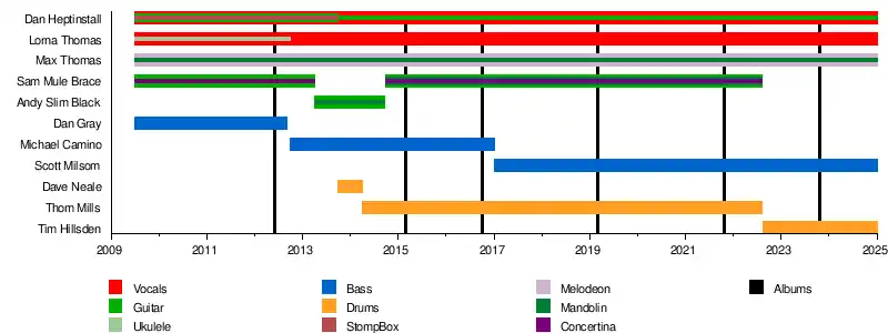 - Sam "Mule" Brace – guitar, concertina, vocals (July 2009 – March 2013, September 2014 – August 2022) mandolin (2014–2022)