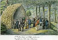 In the park to the south of Countess Danner's Mansion is a grotto which was built by Frederick VII in 1853. It is made of reavertine, flint and iron slags. Its interior features imitated stalactites and the floor is decorated with pale and dark beach stones set in a star-shaped pattern. A winding, partly internal staircase on the rear side of the mound leads to the top for good views of Skodsborg and the Øresund.[8]