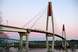 The SkyBridge[1] is a cable-stayed railway bridge in Metro Vancouver, British Columbia, Canada. Built between 1987 and 1989, it carries trains of the Expo Line of TransLink's SkyTrain across the Fraser River between New Westminster and Surrey.[2] The SkyBridge opened for revenue use on March 16, 1990, with the second half of the Phase II extension of SkyTrain to Scott Road station.