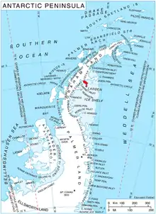 Location of Churchill Peninsula in Graham Land, Antarctic Peninsula.