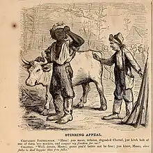 Slave uprisings were a constant fear of slaveholders before and during the war. A slave insurrection was planned in Adams County, Mississippi, which was uncovered in the summer of 1861 leading to widespread punishment of enslaved people in the area.[27] In June 1861, an aborted insurrection occurred in St. Martin's Parish, Louisiana, which resulted in the arrest of forty enslaved black people and the arrest of two white men who led the uprising, one of who was arrested and the other who escaped. In August 1861, a possible uprising in Jefferson County, Alabama involving possibly 400 enslaved people was put down. Slaveholders in mountainous country particular feared uprising as the terrain made it harder for them to monitor the people they enslaved.[28]