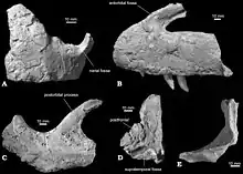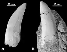 Smok was found in a locality near Lisowice village that is latest Norian to early Rhaetian in age. This area was known to contain Triassic fossils since it was formally described in 2008. The first material of Smok, the jawbone and fragments of the skull, was discovered in 2007. It was first described in 2008 as a theropod dinosaur based on features in its braincase and frontal bone. The material was also thought to represent two individuals.[2] Similarities were noted between the braincase of the animal and that of allosauroids. When the discovery was first announced, it was called "the Dragon of Lisowice" and was purported to be the first member of a line of dinosaurs that led to Tyrannosaurus rex.[3] Bones from other parts of the body were found in 2009 and 2010. Five tracks made by a three-toed archosaur – presumably a theropod dinosaur – were found in rocks that were 1 metre (3.3 ft) above the layer where Smok was found. The footprints may belong to Smok, but the lack of foot bones in the skeleton make this association uncertain.[1]