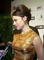 Producers of Mad Men approached January Jones to portray Betty Draper, Don's wife and the mother of their two children. Jones avouched that portraying the character would give the audience an opportunity to see a dark side of her nature.[11] She initially auditioned for the role of Peggy Olson, which was later given to fellow cast member Elisabeth Moss. "It got down between Elisabeth Moss and myself, and it was obviously more suited to her, but Matthew had said, you know, there’s this other role, of the wife."[12] Jones signed a seven-year contract with the show, although her character originally had two lines in "Smoke Gets in Your Eyes." Weiner eventually edited the script to accommodate her desires.[12] "It’s such a testament to his ability," Jones stated. "He just took something out of thin air, which makes me think now that he had to have had an idea that the wife was going to be part of the show, because I kind of took the job with the promise that Betty would be a part of the show. When you sign a seven-year contract, you want to make sure you’re in the show."[12] Christina Hendricks was brought in to play Joan Holloway, the office manager and head of Sterling Cooper's secretarial pool. While Hendricks had previously made recurring appearances on ER before being on Mad Men, her acting career had been largely inactive, and Hendricks' agent urged her not to participate in the project.[13] "They said to me, 'AMC [...] doesn't have any other big shows—why would you do this instead of taking something that's a better bet?' I said, 'Look, I've gone with the one that's the better bet in the past—let's go with the really good script this time.'"[13]