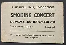 Smoking concerts were live performances, usually of music, before an audience of men only, popular during the Victorian era. These social occasions were instrumental in introducing new musical forms to the public. At these functions men would smoke and speak of politics while listening to live music. These popular gatherings were sometimes held at hotels. The crews of HMS Curlew and HMS Hawkins attended a Smoker aboard USS Huron in Wei-hai-wei harbour, China, on 19 August 1921.