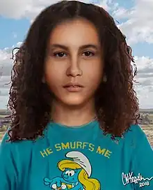 Smurfette Jane Doe is the nickname given to an unidentified teenaged girl who was found dead in Houston, Texas on October 16, 2012.[2] The decedent derived this nickname from the distinctive shirt she was discovered in.[2] The decedent was found concealed in a black plastic garbage bag on the side of a busy road, beside a gravel road leading to an oil field.[3] Due to advanced decomposition a cause of death could not be determined, but the effort to conceal the decedent strongly indicates homicide.[1] Examination of the decedent's bones revealed that she had a facial asymmetry, and that she had likely been either malnourished or ill during her childhood.[3] The decedent was interred in an anonymous grave in a Harris County cemetery.[4]