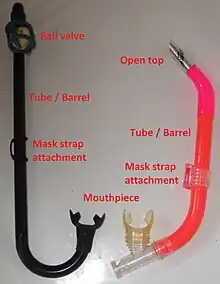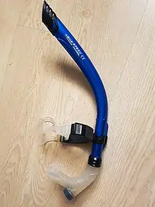 A snorkel is a device used for breathing atmospheric air when the wearer's head is face downwards in the water with the mouth and the nose submerged. It may be either a separate unit, or integrated into a swimming or diving mask. The integrated version is only suitable for surface snorkeling, while the separate device may also be used for underwater activities such as spearfishing, freediving, finswimming, underwater hockey, underwater rugby and for surface breathing while wearing scuba equipment. A standard snorkel is a curved tube with a shape usually resembling the letter "L" or "J", fitted with a mouthpiece at the lower end and made from plastic, synthetic elastomers, rubber, or light metal.[1] The snorkel may have a loop or a clip to attach it to the head strap of the diving mask or swimming goggles, or may be tucked between the mask-strap and the head.[2] Some snorkels are fitted with a float valve at the top to prevent flooding if the top opening is immersed, and some are fitted with a water trap and purge valve, intended for draining water from the tube.