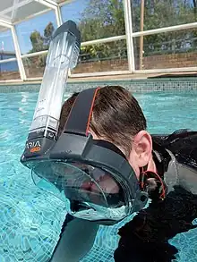 Some snorkels have a sump at the lowest point to prevent a small volume of water remaining in the snorkel from being inhaled when the snorkeler breathes. Most of these also have a non-return draln valve in the sump, to drain water from the tube when the diver exhales. The water is pushed out through the valve when the tube is blocked by water and the exhalation pressure exceeds the water pressure on the outside of the valve. This is similar to the mechanism of blast clearing which does not require the valve, but the pressure required is slightly less, and effective blast clearing may require a higher flow rate. When the water level in the snorkel drops sufficiently for exhaled air to bypass over the water, much of the effectiveness of the drain valve is lost, and the remaining water may not all be ejected. The full-face snorkel mask may have a double airflow passage with non-return valves to reduce dead space in the tubes, one tube providing inflow and the other for outflow, but the interior of the mask remains a large dead space unless an orinasal pocket is included. The full-face mask encloses the nose and mouth in the same volume which is connected to the snorkel tube or tubes, which allows breathing through the nose in addition to the mouth.[13] A few models of separate snorkel have float-operated valves attached to the top end of the tube to keep water out when a wave passes, but these cause problems when diving as the snorkel must then be equalized during descent, using part of the diver's inhaled air supply. Some recent designs have a splash deflector on the top end that reduces entry of water that splashes over the top of the tube, thereby keeping it relatively free from water at the surface.[14]