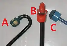 Among recent innovations is the "collapsible snorkel", which can be folded up in a pocket for emergencies for scuba divers who may not need a snorkel on every dive.[66] One for competitive swimmers is a lightweight training snorkel with twin inlet tubes, which exhausts through a valve underwater, similar to the exhaust valve of a diving demand valve, so the dead space is restricted to the mouthpiece volume;[67] another is a "restrictor cap" placed inside a snorkel barrel "restricting breathing by 40% to increase cardiovascular strength and build lung capacity".[68] Some additional snorkel features such as shut-off and drain valves fell out of favour decades ago, only to return in the contemporary era as more reliable devices for incorporation into "dry" and "semi-dry" snorkels.[14]