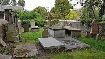 The use as a burial ground was terminated in 1934 by the Medical Officer of Health but may still be used for interment of ashes. Only the burial zone within the former church walls survive but the burials originally extended beyond the walls, especially to the south side.[1]