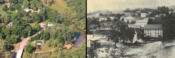 A comparison of a portion of Snowville in 2010 (left) and from the 1800s (right) when the town was at its peak. The left image shows the relatively new Snowville Bridge, along with the old theater (center right) and the Mason Lodge. The older image shows the foundry, woolen mill, flour mill, theater (center), and store. The old image is courtesy of Tami Ramsey and from the Early History of Snowville by Louise B. Allison.