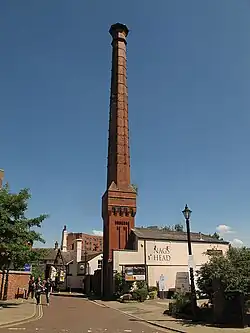The red brick chimney is located behind The Nag's Head on Tuttle Street[3] and is considered a Wrexham landmark. It is a visible companion to the nearby St Giles' Church which both can be seen from afar alongside each other.[4][5] The chimney marks the site of one of the 19 former breweries located in Wrexham in the 1860s.[6][7]