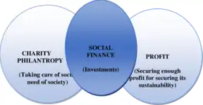 Social finance is a category of financial services which aims to leverage private capital to address challenges in areas of social and environmental need.[1] Having gained popularity in the aftermath of the 2008 Global Financial Crisis, it is notable for its public benefit focus.[2][3][4] Mechanisms of creating shared social value are not new, however, social finance is conceptually unique as an approach to solving social problems while simultaneously creating economic value.[5][6] Unlike philanthropy, which has a similar mission-motive, social finance secures its own sustainability by being profitable for investors.[7] Capital providers lend to social enterprises who in turn, by investing borrowed funds in socially beneficial initiatives, deliver investors measurable social returns in addition to traditional financial returns on their investment.[8]