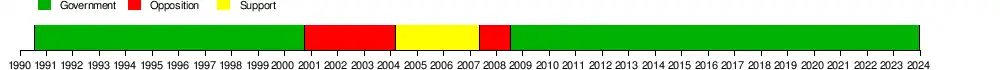 | Year | Leader | Popular vote | % of popular vote | # | # of seats | Seat change | Coalition | Status | Ref. |
