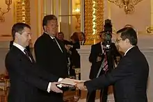- ↑ "The ambassadors of ten countries presented their letters of credence to Dmitry Medvedev". The Kremlin, Moscow: Presidential Press and Information Office. 12 October 2009. Archived from the original on 28 March 2020. Retrieved 28 February 2010.