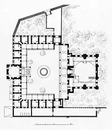 The mosque is noted for its architecturally challenging location on a steep slope. Sinan resolved this issue by fronting the mosque with a two-storey courtyard. The bottom storey was divided into shops, whose rents were intended to help support the upkeep of the mosque. The upper storey with an open colonnaded courtyard had the spaces between the columns on three sides walled off to form small rooms, each with a small window, fireplace and niche to store bedding, forming the living accommodations for a madrasah. The fourth side of the courtyard is the mosque itself, which is designed as a hexagon inscribed in a rectangle, topped by a dome with four small semi-domes in the corners.[3] The dome is 13 metres (43 ft) in diameter and 22.8 metres (75 ft) high.[4] The ablution fountain in the courtyard has twelve columns supporting an onion shaped dome.[5] The single minaret is placed at the northeast corner of the mosque.[6]