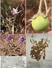 • McDonnell, Angela J.; Wetreich, Heather B.; Cantley, Jason T.; Jobson, Peter; Martine, Christopher T. (18 June 2019). "Solanum plastisexum, an enigmatic new bush tomato from the Australian Monsoon Tropics exhibiting breeding system fluidity". PhytoKeys (124): 39–55. doi:10.3897/phytokeys.124.33526. PMC 6592974. PMID 31258372. The present article incorporates text and images from this source, which is available under the Creative Commons Attribution License (CC BY 4.0).