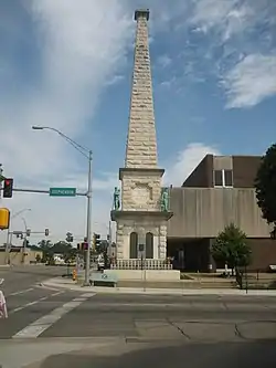 The Soldiers' Monument is an American Civil War memorial located at the northern corner of Galena Avenue and Stephenson Street in Freeport, Illinois. General Smith D. Atkins designed the monument, which was erected in 1871. The limestone obelisk monument is 83 feet (25 m) tall; a statue of Victory originally topped the monument, but it was destroyed by a lightning strike in 1960. Marble tablets at the base of the memorial listed the names of Stephenson County's Civil War casualties; these were reversed and covered by bronze plaques in 1924 to allow space to list all of the county's Civil War veterans. Four 7-foot (2.1 m) statues were located at the corners of the base, which were replaced by identical replicas in 1924. The statues represent soldiers from each major branch of the Union military: the Infantry, Cavalry, Artillery, and Navy.[2]