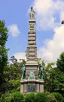 The monument is a square, castellated column of New Hampshire granite from Nashua on a base of Quincy granite, atop which stands a figure of Victory, dressed in classical Roman garments and holding an American shield and a laurel wreath. Its base is ornamented with bronze statues of a soldier and sailor, and bronze reliefs depicting the Goddess of Liberty overseeing the reconciliation of the South with the North, an emancipation scene with a Union soldier extending a scroll to a kneeling figure, and the sinking of the Alabama by the Kearsarge. At its front is a sculpture of a saddle draped with cavalry clothing and equipment; at the rear is a sculpture of Civil War-era weapons.