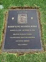 On October 21 a wake and meditation service was held at the Pierce Brothers Valley Oaks Griffin Mortuary at Westlake Village.[177] Burke's funeral was at 10:00 am on October 22, 2010, at the City of Refuge in Gardena, California and was open to the public. It was simulcast on the internet and at a memorial service held at the Sharon Baptist Church in Philadelphia,[177] that was led by Minister Lester Fields and Solomon's younger sister, Apostle Laurena Burke Corbin,[178] the pastor of Our First Temple of Faith Mt. Deborah Pentecostal Church on Haverford Avenue in Philadelphia,[179] and attended by Burke's extended East Coast family.[178]