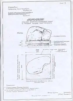 The unhewn stone was successfully transported to St. Petersburg where on 4 September 2002 it was installed on the pedestal. Three more inscriptions were added around the four edges of the base.[21] It was 12 years to the day since the base was put in position.[20] The official inauguration took place on 30 October on the Day in Remembrance of the Victims of Political Repression, which coincided with the 300th Anniversary of St. Petersburg. City Governor Vladimir Yakovlev issued Decree No. 2572-pa, making the Solovki Stone city property[21][22] as of 15 October 2002.