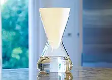 The Soma water filtration system consists of a glass carafe and a biodegradable water filter.[2] The carafe is contoured to fit hands and has a beveled edge to prevent spilling.[3][11] The filters are made from Malaysian coconut shells, vegan silk, and food-based PLA plastic, and are delivered to customers via a subscription service every two months.[2][11] The filter was designed by David Beeman, who created the water formulas for Starbucks and Peet's Coffee.[11] Soma has also partnered with charity: water to donate clean drinking water to those in need through the sale of every filter.[12]