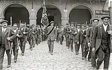 On September 17, 1923, only two days after the triumph of the coup d'état that established the dictatorship of Primo de Rivera, the Militar Directory issued a royal decree extending the Catalan institution of the Somatén to all the provinces of Spain.[3] According to the Royal Decree, the Somatén Nacional, which was the first official name it received, would be recruited within a month by the captains general, under the command of a Brigadier General. In the Decree, Primo de Rivera explained that the Somatén was not only an auxiliary force for the maintenance of public order but also a "spur of the spirits" to stimulate citizen collaboration with the new regime. In spite of the fact that Primo de Rivera in a speech pronounced before Mussolini on November 21, 1923, pretended to equate it with the Fascist "black shirts", the Somatén "was an armed corps of bourgeois of order, created from, by and for the power", although some workers from the Sindicatos Libres were also integrated into it. As Primo de Rivera said, the Somatén "has as its motto peace, justice and order, which are the three postulates of true democracy".[4]