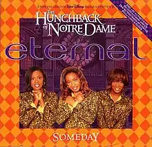 Selected as the lead single from the film's soundtrack in 1996, "Someday" was recorded by all–male R&B group All-4-One for the North American release, while British female R&B trio Eternal recorded their own version for the British English version of the song which received international release throughout Europe and Oceania. Mexican singer Luis Miguel recorded a Spanish version for the Latin American market, retitled "Sueña", which became a major hit. The Italian version was recorded by Neri per Caso, retitled "Quando". The youngest Celtic Woman member Chloë Agnew covered this song for her solo album called Walking in the Air and her first Celtic Woman album. Jackie Evancho covered this song for the Target deluxe version of her album Dream With Me.[1] The Korean version was recorded by R&B trio Solid, which was released in Korea as a bonus track of the original soundtrack album.[2] In 2016, the song was included in the musical version of the film as performed by Ciara Renée and Andrew Samonsky as Esmeralda and Phoebus.