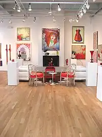 Abstract and representational artwork in all visual disciplines was on display in the gallery's 9,600-square-foot (890 m2) setting. Somerhill featured fine art glass and jewelry, a contemporary photography gallery, an open-air glass atrium which stood at the center of the main salon where featured exhibitions were shown. The gallery also featured white oak floors, fabric walls and over 40 skylights.