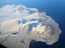 Aerial photo of Sørkapp Land, showing the bay of Sommerfeldtbukta in the lower mid part of the photo, with the nearby mountain of Kistefjellet.
