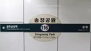 Songjeong Park station (Korean: 송정공원역; Hanja: 松汀公園驛) is a station of Gwangju Metro Line 1 in Songjeong-dong, Gwangsan District, Gwangju, South Korea. It serves as a transit station using local buses for citizens living in residential areas such as Hanam, Unnam, and Suwan. There is a subway literature museum at this station.