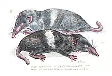 The supposed shrew species was given a scientific name by Anthony Cheke which was first published in 2012[1] but the description was not considered valid by some as the holotype was not explicitly designated (in this case the illustration, as there was no specimen) and it was therefore redescribed in 2018. The species was placed tentatively in the genus Diplomesodon which is nested within Crocidura according to a molecular phylogenetic study.[2] Cheke placed the species tentatively in the genus based on the observation that the only other shew species with a piebald pattern was in the central Asian species Diplomesodon pulchellum. Considering that no specimen matching the species has ever been found ever since, it is thought that the species has since gone extinct.[3]