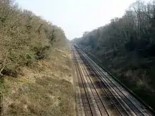 Sonning Cutting is on the original Great Western Railway built by Isambard Kingdom Brunel.[1] It is to the east of Reading station and to the west of Twyford station near the village of Sonning in Berkshire, England. The railway's originally planned route had been around the north of Sonning Hill past the village. But because of local objections the railway bypassed the village in a cutting, over 1-mile (1.6 km) and up to 60 feet (18 m) deep, through the hill, giving a more direct route between Twyford and Reading.[2]