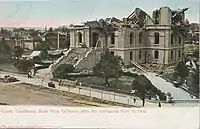 After the 1885 courthouse was destroyed in the 1906 San Francisco earthquake, a replacement was completed in 1910, designed by J.W. Dolliver.[7] Following an earthquake in 1957, an examination of what was initially thought to be superficial damage to the building's fascia led to an estimate of $425,000 in needed repairs. The terra cotta cladding was stripped in 1958, and a consultant for the city recommended abandoning and selling the building.[8] The 1910 replacement was demolished in 1966 after being declared seismically unsafe; the site was rededicated as "Old Courthouse Square" in 1967.[9] The 1910 building, which had included a significant amount of reinforcing steel, was so sturdy the contractor hired to demolish it was unable to complete the razing within the 75-day window allotted.[8]