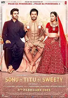 Sonu Ke Titu Ki Sweety (transl.Sonu's Titu's Sweety) is a 2018 Indian Hindi-language romantic comedy film written and directed by Luv Ranjan. Produced by Luv Films and T-Series Films, the film was written by Luv Ranjan and Rahul Mody and edited by Akiv Ali. It stars Kartik Aaryan, Nushrat Bharucha and Sunny Singh.[3][4] The film was released theatrically on 23 February 2018.[5]