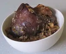 Soul food originated in the home cooking of the rural Southern United States and has its origins in slavery, using locally gathered or raised foods and other inexpensive ingredients. Rabbits, squirrels, and deer were often hunted for meat. Fish, frogs, crawfish, turtles, shellfish, and crab were often collected from fresh waters, salt waters, and marshes.[7] Soul food originated during the time of slavery, when Black American/ African American enslaved people were given only leftovers and the undesirable parts of animals, such as ham hocks, hog jowls, and pigs' feet, ears, skin and intestines, which white plantation slave owners did not eat.[8] Pork and corn were two staple items in the Southern United States for both slave owners and slaves. The slave owners would have smoked ham and corn pudding while the enslaved were left with the offal.[9]