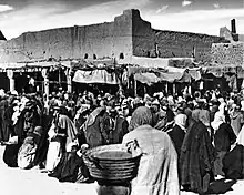 Haraj bin Qassim has its origins around the 1940s in the Deera Square, in front of present-day Grand Mosque of Riyadh in the city's ad-Dirah neighborhood. It is attributed to a person called ibn Qassim (transl. Son of Qassem), who is believed to be the eponymous founder of the souq after King Abdulaziz granted him the land for setting up an auction market.[10][11] It was later relocated to al-Batʼha Street in al-Manfuhah neighborhood in 1971.[12] One branch of the souq was also opened in Asir Street and Raʾīs Street, in close proximity to al-Shumaisi neighborhood but was soon closed down as the site was unspecified for the purpose by the authorities.[11] In 2007, the Riyadh Municipality announced that it would be relocating the souq further south of al-Batʼha Street in a 48-hectares area allotted in the al-Masani neighborhood, in close proximity to the al-Mansurah district.[13] The land was donated by Prince Sattam bin Abdulaziz and after conducting a well-planned study of the area,[14] the market was shifted there in 2014.[15]