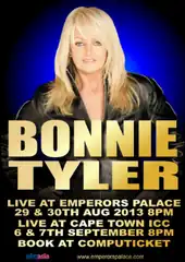 The South Africa Tour 2013 was a tour by Welsh singer Bonnie Tyler, and marked 20 years since her concert in the country.[1] The tour was widely reported by South African media and followed the release of her album Rocks and Honey (2013) and her appearance on the Eurovision Song Contest 2013.[2][3] The first two shows in Johannesburg both sold out.[4] It was announced upon her visit that her new album will be released in South Africa "very soon".