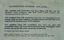 During 2015, the Class 15E fleet began to be equipped with new multiple unit (MU) hardware and train control and monitoring system (TCMS) software. Modified locomotives carried temporary plaques on their front doors to indicate that the modification had been carried out and to warn train crews that the locomotive may not be connected to an unmodified locomotive by multiple unit jumper cable. Modified locomotives could only be used with unmodified locomotives through the radio distributed power system.